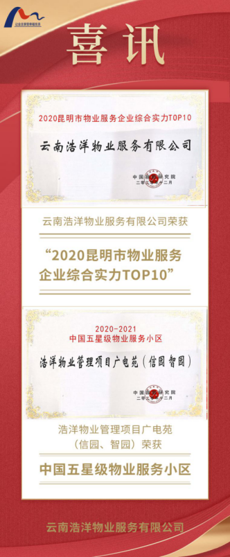 喜訊,我公司榮獲“中國指數(shù)研究院”頒發(fā)的“2020昆明市物業(yè)服務(wù)企業(yè)綜合實(shí)力TOP 10”榮譽(yù)稱號,其中,我公司服務(wù)管理的“廣電苑-信園”、“廣電苑-智園”小區(qū),榮獲“中國指數(shù)研究院”頒發(fā)的“中國五星級物業(yè)服務(wù)小區(qū)”榮譽(yù)稱號。