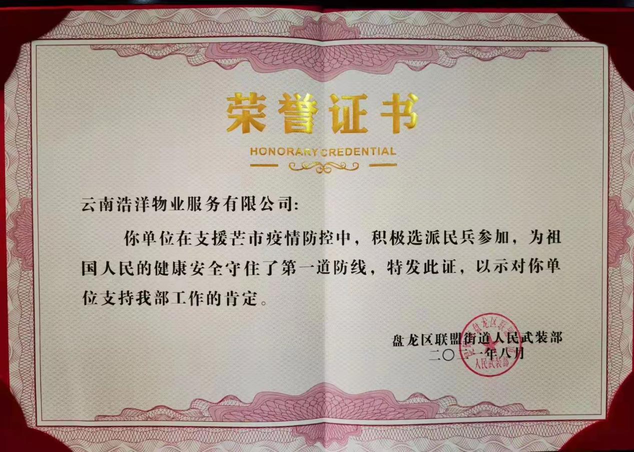 近日,我公司被盤龍區(qū)聯(lián)盟街道人民武裝部頒發(fā)榮譽(yù)證書,證書中表示“我公司在支援芒市疫情防控工作中,積極選派民兵參加,為祖國人民的健康安全守住了第一道防線”。